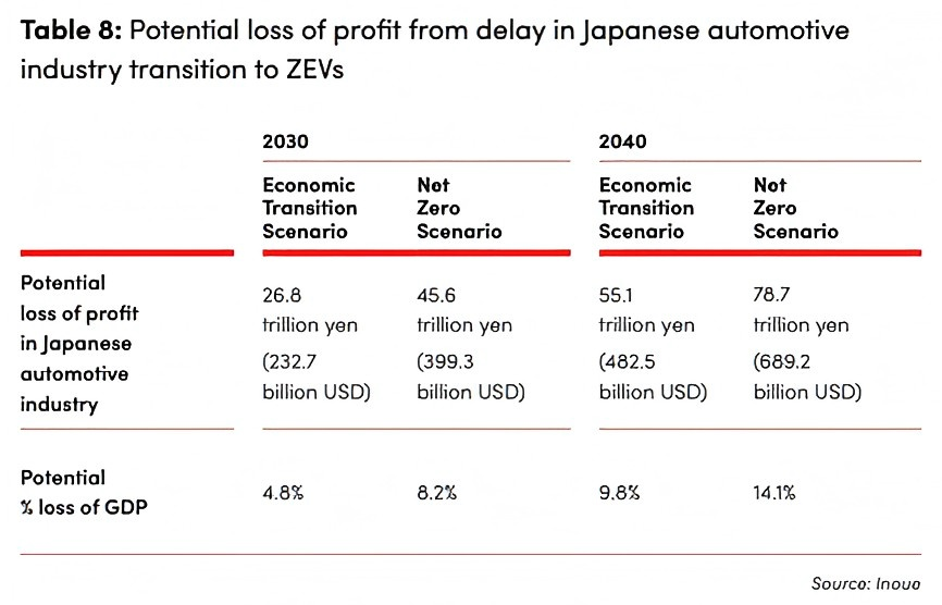 2022年,国际非营利气候组织Climate Group发布的一项独立报告称,若日本的汽车工业不能及时将重心转向纯电动汽车,那么到2030年,将损失一半的汽车出口和超170万个工作岗位;到2040年,将损失14.1%的GDP以及近80万亿日元的利润。